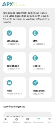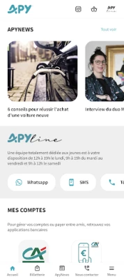 - La APY line : pour les clients APY de 18 à 30 ans, retrouvez tous les moyens pour contacter votre banque (téléphone, SMS, mails, WhatsApp, Instagram).