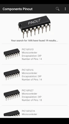 This application provides an offline database with more than 80000 electronic component pinouts. Chips, Transistors, Diodes, Triacs, Microprocessors, and much more.